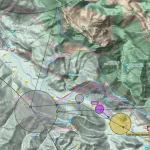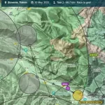 Nalogo smo vnesli vsak v svojo navigacijsko napravo, za lažje razumevanje pa nekaj pojasnil. Zelen cilinder je štartni cilinder, kjer se v zraku čaka do v naprej določene ure, ko se začne z letenjem do naslednje obratne točke, katere so določene z različnimi radiji. Radij je običajno najmanjši 0,4 km, največji je bil pa tudi 18 km. Torej večji kot je radij, več možnosti različnih poti do točke obstaja in obratno.